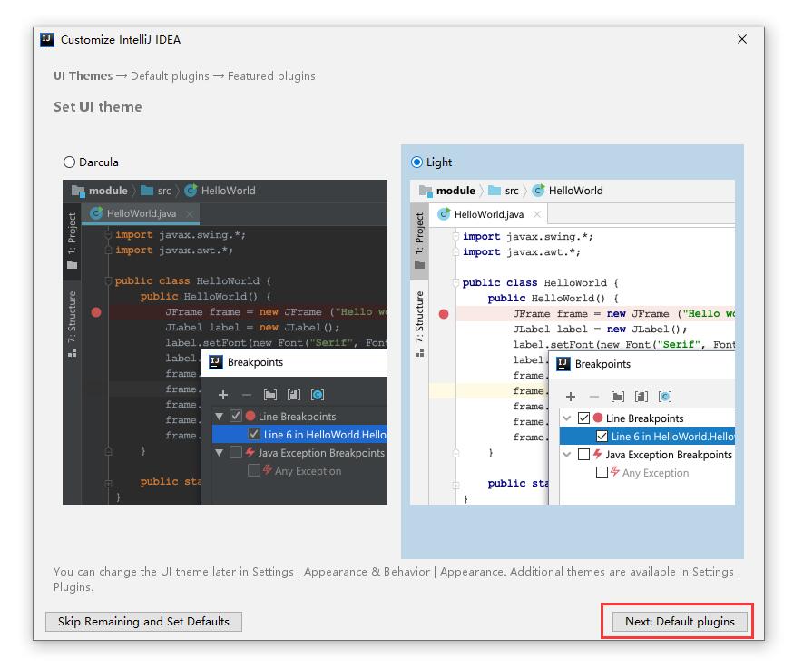 根据自己的偏好选择深色或亮色主题,然后点击 Next Default plugins 按钮: