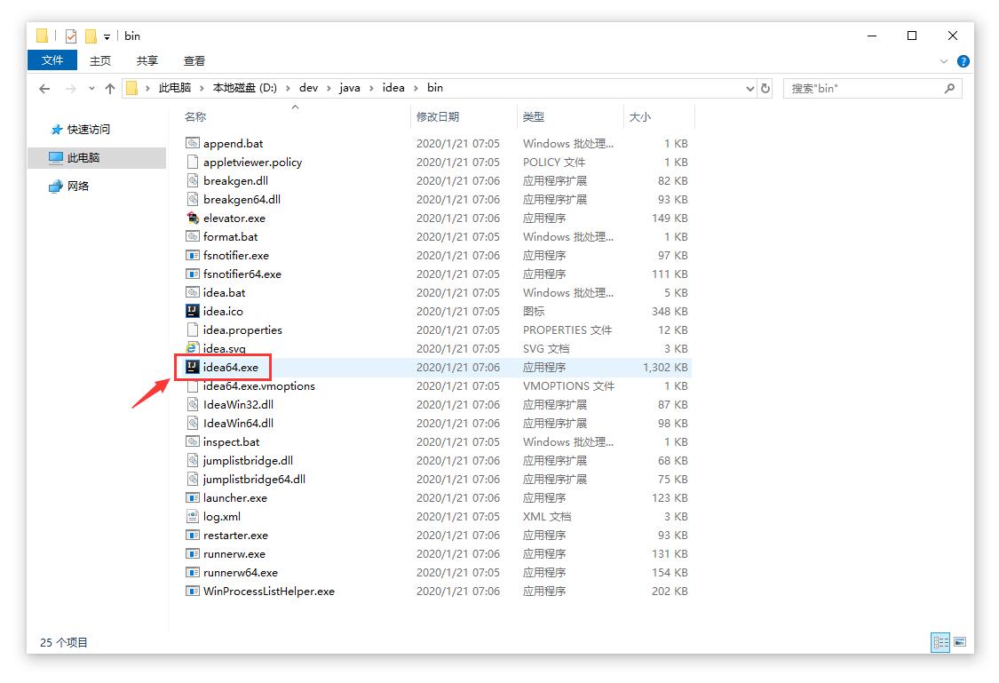 在 bin 目录下找到 idea64.exe 文件,这就是IDEA的启动程序。为了以后启动方便,你可以把它发送到 桌面快捷方式