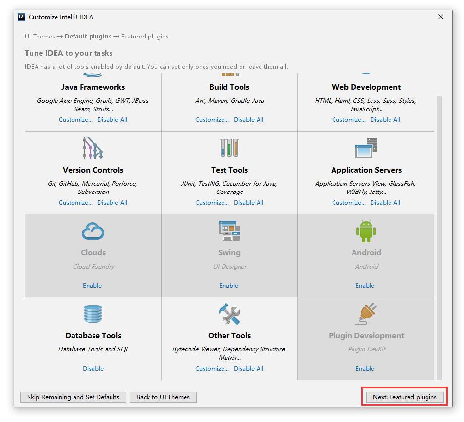 这里我们可以根据需要启用或关闭一些插件,建议禁用:Clouds、Swing、Android、Plugin Development 这4个模块(可以节省内存)。然后点击 Next Featured plugins 按钮: