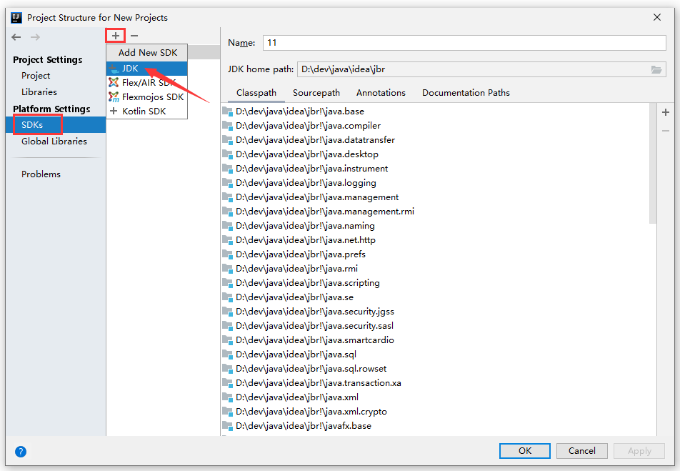选择 左侧菜单【SDKs】,然后点击【+】添加 JDK
