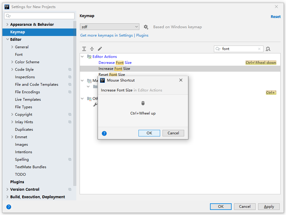 Increase Font Size 为放大字体操作。按住键盘上的 Ctrl 键不放,同时鼠标滚轮向上滚动。IDEA会识别出你的设置,点击 OK 按钮保存设置。