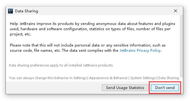 此处我们选择不发送使用数据,点击 Don't send 按钮: