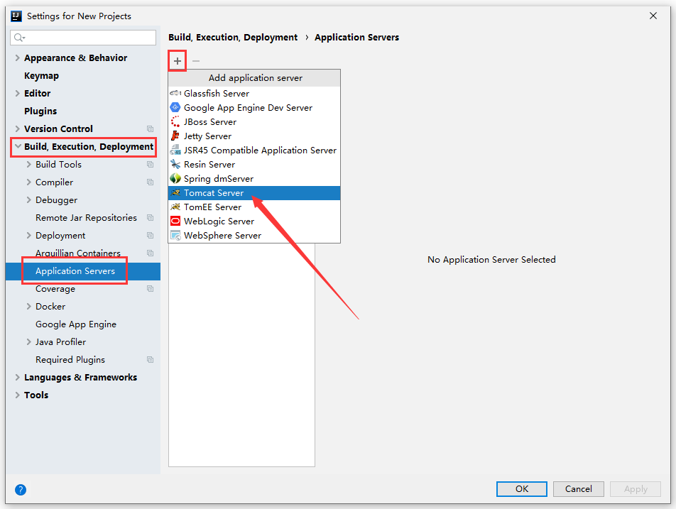 选择左侧菜单【Build, Execution, Deployment】,然后点击【+】添加 Tomcat