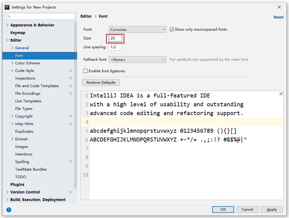 选择左侧菜单【Editor】- 【Font】,将默认的字体大小改成 20