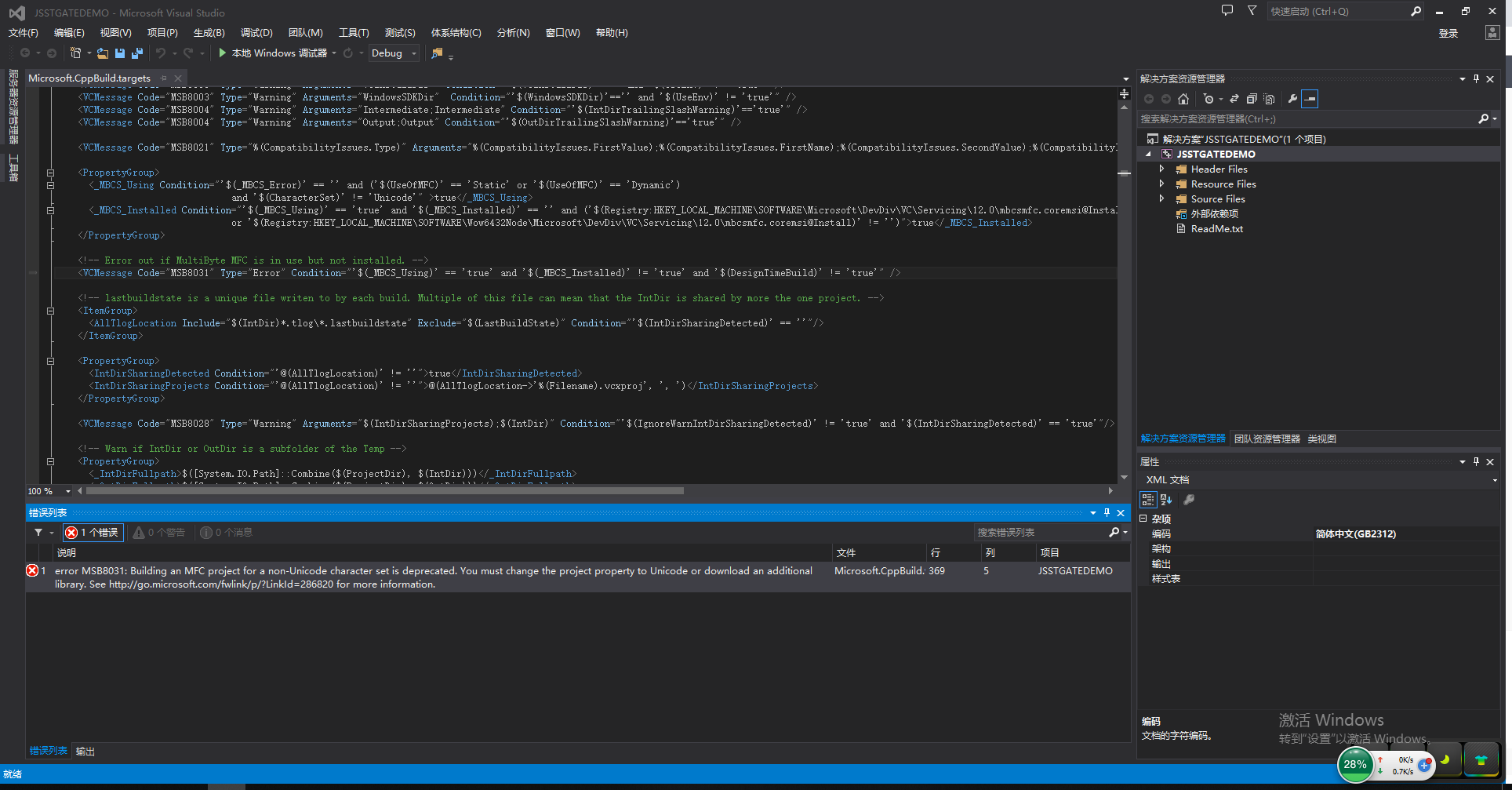 错误 1 error MSB8031: Building an MFC project for a non-Unicode character set is deprecated. You must change the project property to Unicode or download an additional library. See http://go.microsoft.com/fwlink/p/?LinkId=286820 for more information. C:\Program Files (x86)\MSBuild\Microsoft.Cpp\v4.0\V120\Microsoft.CppBuild.targets 369 5 JSSTGATEDEMO