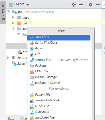 最后就可以创建AspectJ文件写代码了。这一步如果没有看到Aspect这个选项,说明配置没有成功。