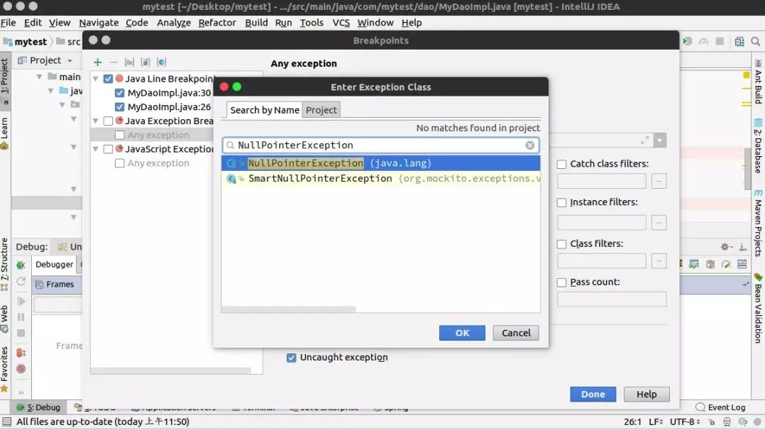 设置方式一样是先点击 view breakpoints,之后点击 + 号添加异常断点,这边添加了 NullPointerException。