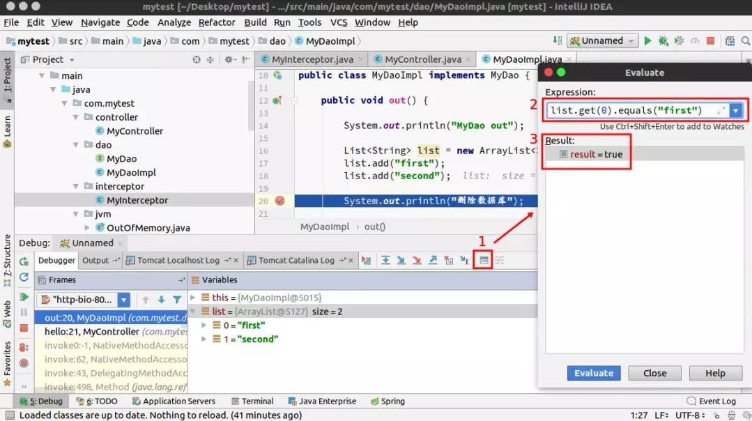 假设在 Debug 模式下,想要快速比较当前 list.get(0).equals("first") 的结果,可以不用改代码,直接在计算表达式里面运算,让 IDEA 快速帮助我们计算出这个函式会回传的值,非常方便,像是下面的 3. Result 部分,得到的就是使用计算表达式运行 list.get(0).equals("first") 的结果。