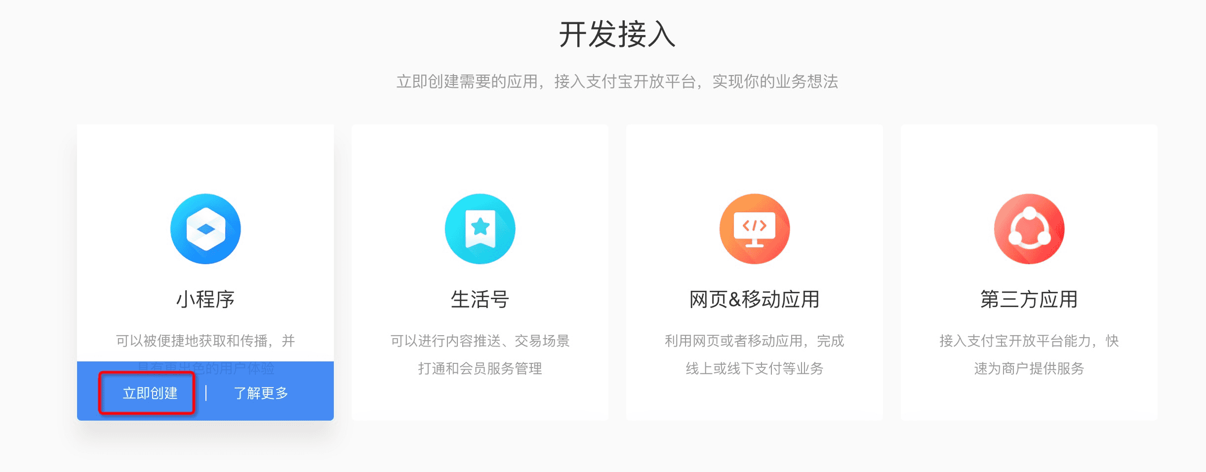 - 使用支付宝账号登录 蚂蚁金服开放平台进入开发者中心 创建小程序,填写基本信息,并记录下 APPID