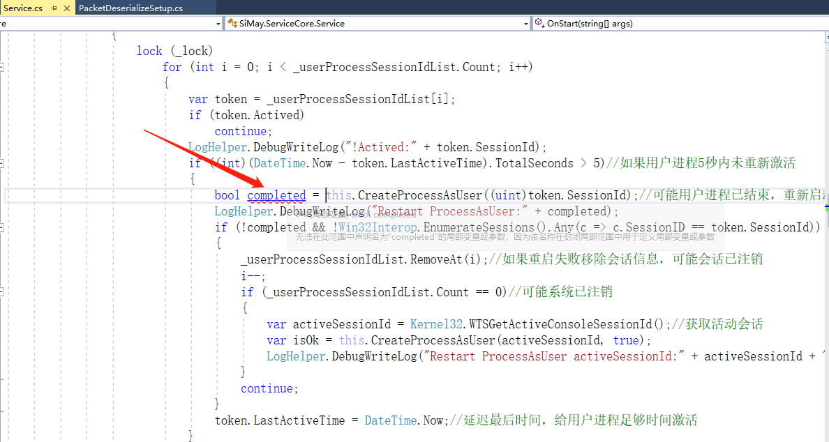 错误    CS0136    无法在此范围中声明名为“completed”的局部变量或参数,因为该名称在封闭局部范围中用于定义局部变量或参数    SiMay.ServiceCore    SiMay.RemoteClient.NewCore\TrunkService\Service.cs    118    活动的
