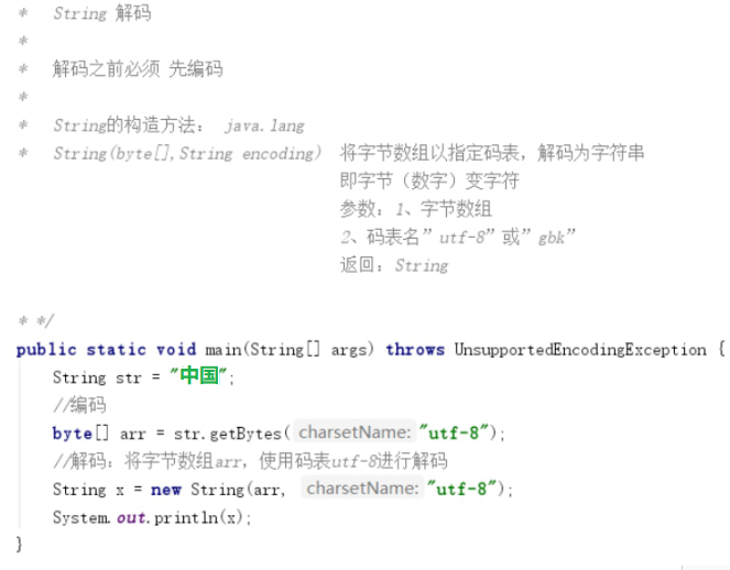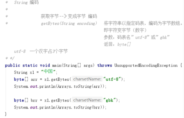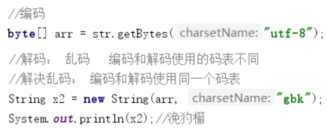 将字符串以指定码表,编码为字节数组。 即字符变字节(数字) 参数:码表名”utf-8”或”gbk” 返回:byte[] |