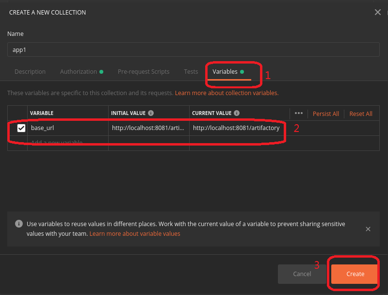 在Variables标签条件变量:base_url,值为artifactory“Custom Base URL”,例如: http://localhost:8081/artifactory