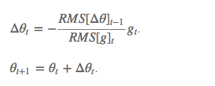 RMS:梯度的均方根 root mean squared RMS[g]是对( + ε)求平均的。E 的计算公式相当于t 时刻的依赖于前一时刻的平均和当前的梯度。之前所有的梯度的加和这一项给一个可以改动的权重,此外,还将学习率 η 换成了 RMS[Δθ],这样的话,我们甚至都不需要提前设定学习率了。