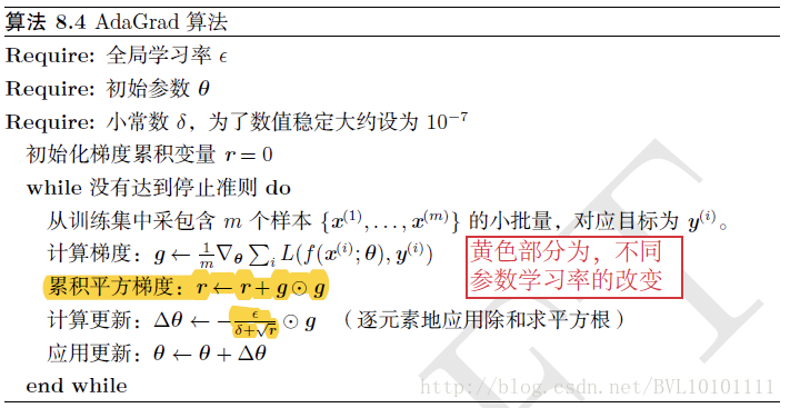 在随机正常梯度下降(SGD)基础上,改进了学习率,原来求的g之后,之接θ=θ-εg,而现在对ε进行了改进。相当于学习率是当前学习率/全局梯度和