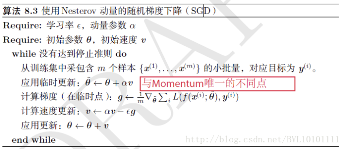 其中θ相当于权重,v相当于梯度,那么在求当前的g的时候其实用的不是上一步的权重,而是有一个假象的这步结束之后的权重,及:临时更新那步。之后得到当前步的g,剩下的与牛顿动量相同。就是每次计算梯的时候用下一次的权重,这样下一次的变化就会反应在这次计算的梯度上,如果下一次权重计算的梯度很大,则说明更新权重的时候更应该把下一次的梯度给加上去。
