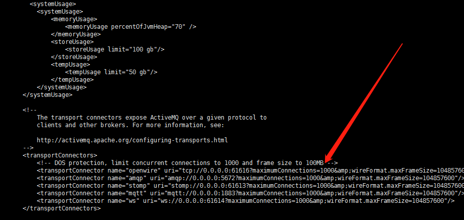 其中配置Transport Connector的文件在ActiveMQ安装目录的conf/activemq.xml中的<TransportConnectors>标签内