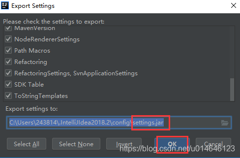 1.打开旧IntelliJ IDEA:File-->Export Settings如下图1,点击ok导出settings.jar文件如下图2