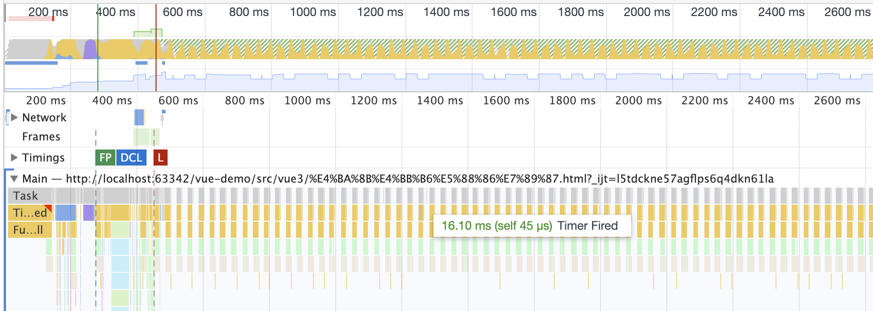 效果图, 计算密集型任务被分到每次只执行16ms, 每次执行完毕留给浏览器时间去响应事件