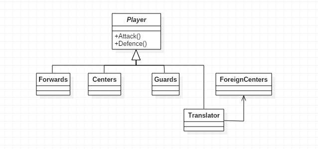 下面我们以翻译官为例,姚明刚去美国时,不懂英文,专门为他配备了翻译,特别是在比赛场上,教练、队员与他的对话全部都通过翻译来沟通,这里翻译就是适配器。现在编写一个适配器模式的例子,火箭队比赛,教练叫暂停时给后卫、中锋、前锋分配进攻和防守任务。UML图如下: