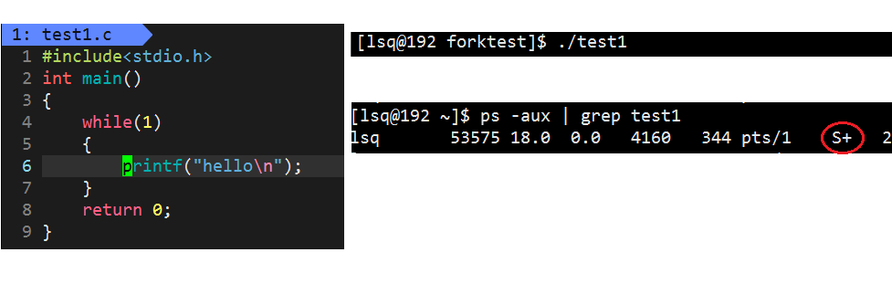这是因为在上面的程序中我们使用了printf()函数来进行写入,既然有写入那就有等待,而I/O的速度远慢于CPU的处理速度所以状态看起来就是S+了。