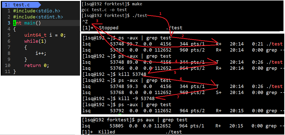 注意: 单独的kill 命令 不能杀死处于T 停止状态的进程,kill -9 +进程号 可以强杀一切处于任何状态的进程