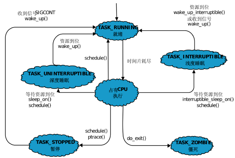 - 僵死状态(Zombies)是一个比较特殊的状态。当进程退出并且父进程(使用wait()系统调用,后面讲)没有读取到子进程退出的返回代码时就会产生僵死(尸)进程。