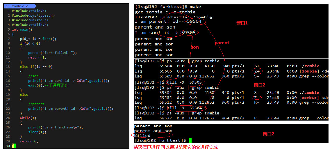 - 所以,只要子进程退出,父进程还在运行,但父进程没有读取子进程状态,子进程进入Z状态