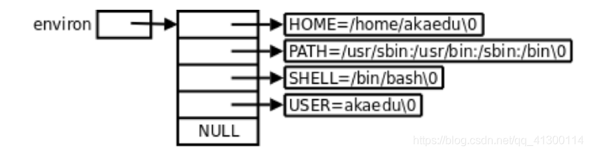 每个程序都会收到一张环境表,环境表是一个字符指针数组,每个指针指向一个以’\0’结尾的环境字符串。