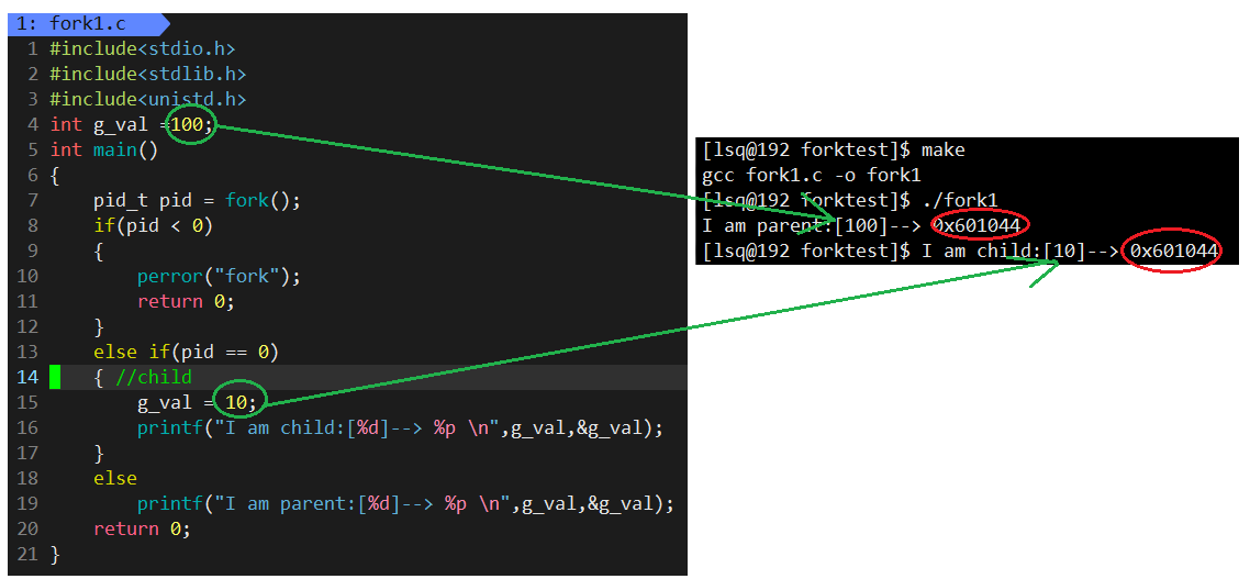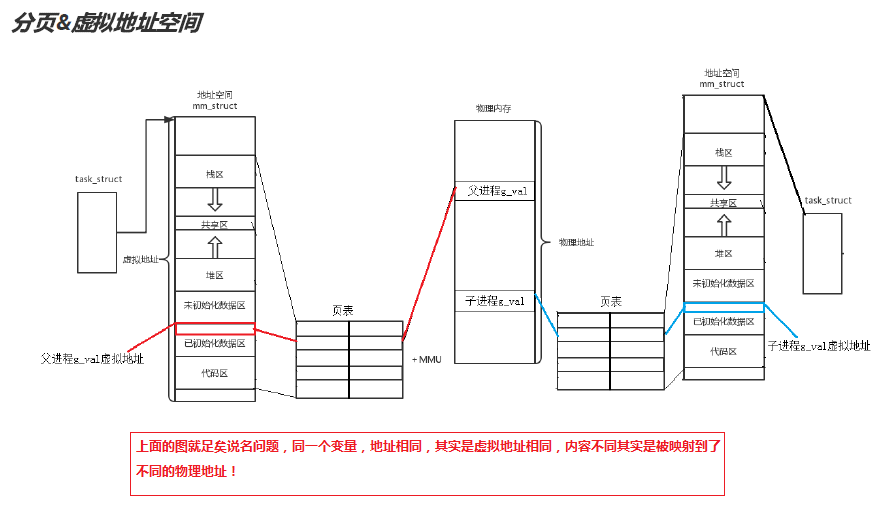 上面这个例子我们发现在未修改之前g_val值为100,在子进程中修改之后值为10 父进程未做修改值还是100.但父进程和子进程中g_val的地址竟然一样,那这是为什么?