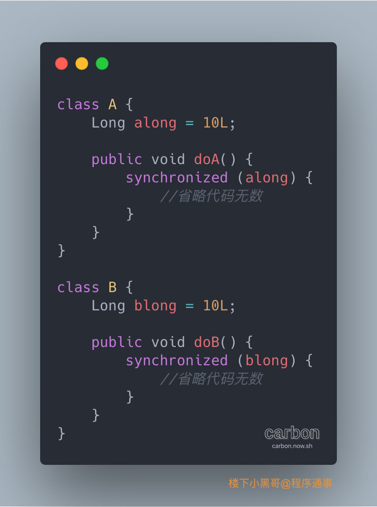 上面代码看起来 A 类使用 along 这个对象锁,而 B 类使用 blong 这个对象锁,看起来两个风马牛不相及,但是实际上两个对象由于 Cache 机制,导致其实际上使用同一个对象,A 与 B 共用同一把锁。