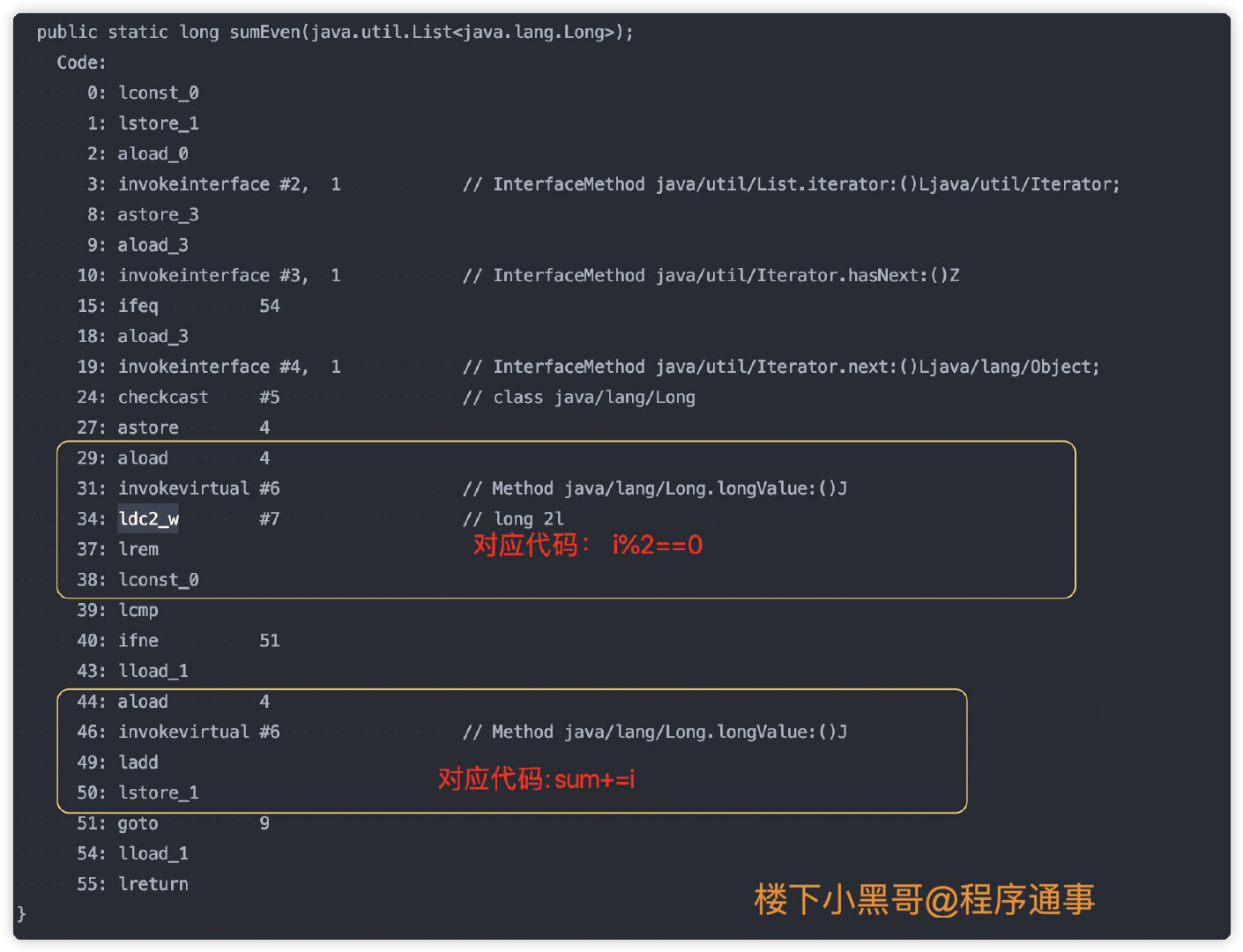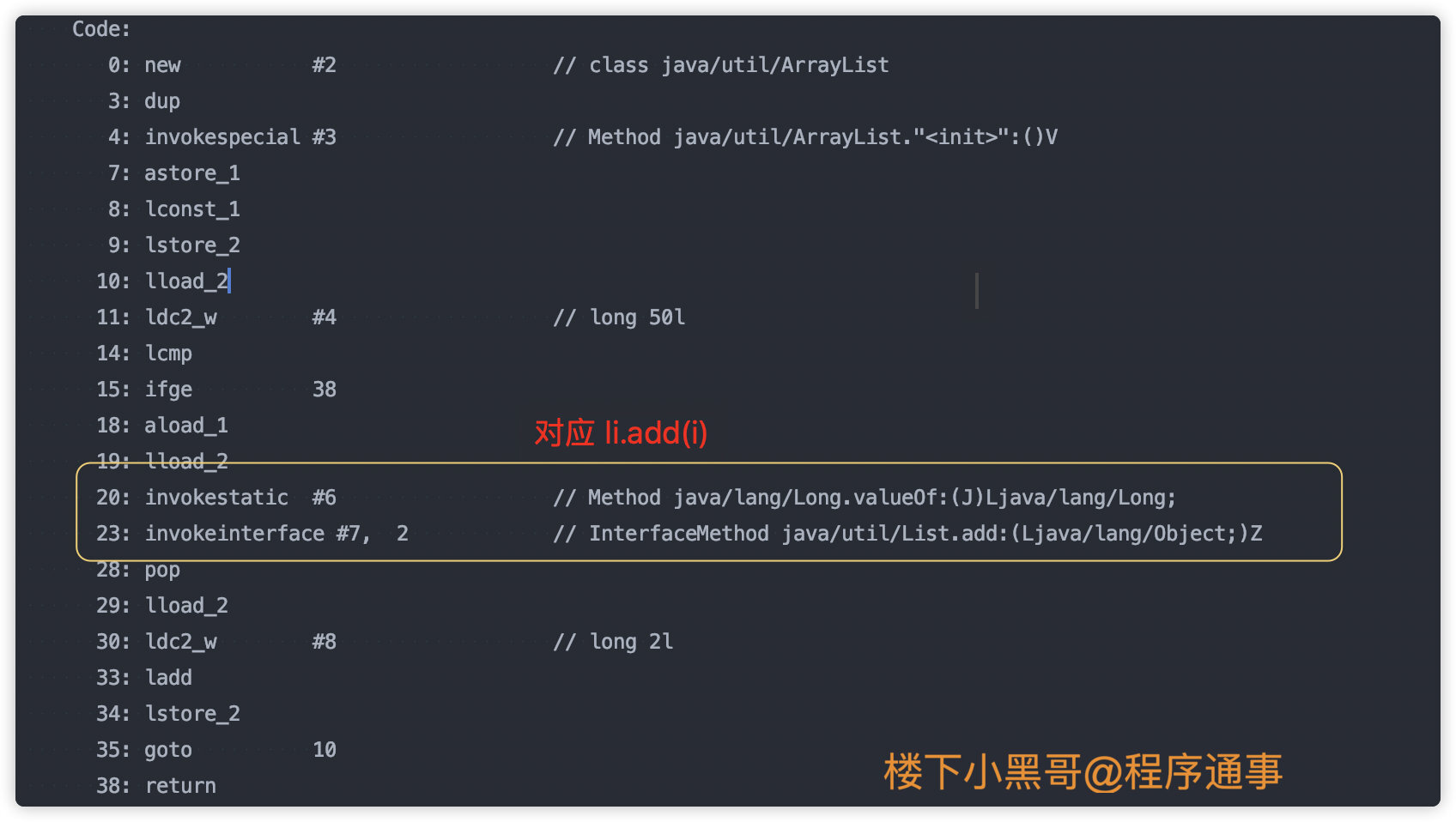 图上黄线标注的字节码对应的代码为 li.add(i)。从这我们可以看到 long 类型的自动装箱实际上调用 Long#valueOf 方法。所以编译器运行时将之前的代码转换为下面的代码