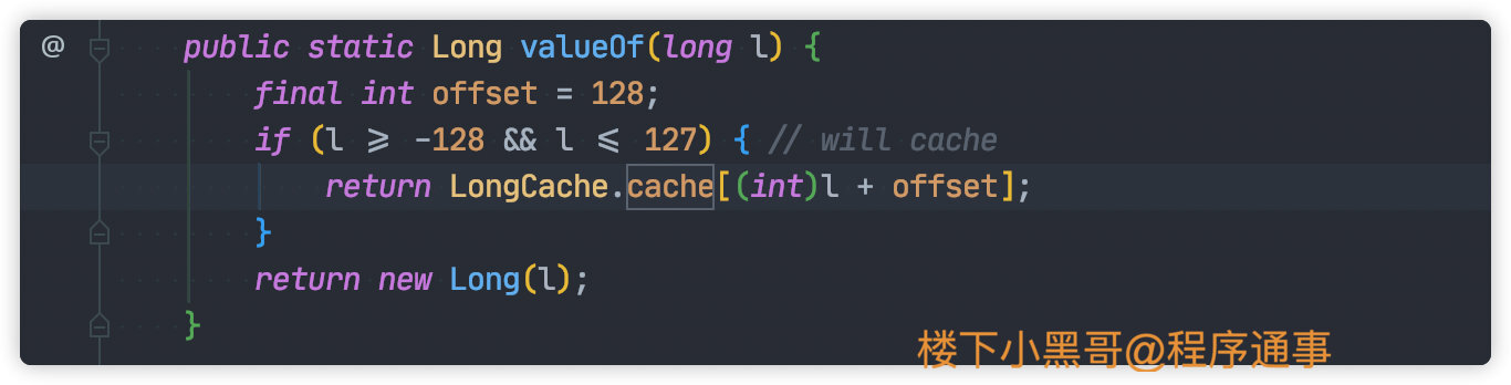 这里输出结果之所以为这样,主要与 LongCache 有关。自动装箱进制将会调用 Long#valueOf,其源码如下: