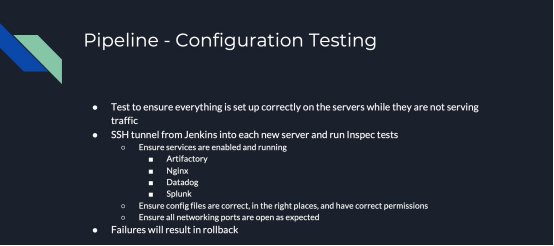 在工作节点上线前需要对其配置进行检测,Jenkins通过ssh方式驱动新节点进行测试,确保Artifactory,Nginx,Datadog,Splunk这些工作节点运行正常。