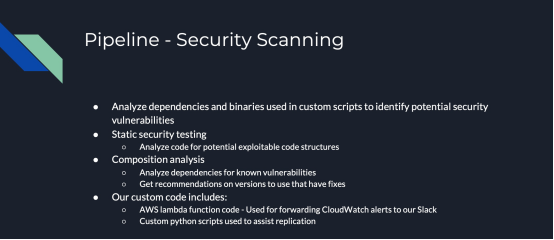 Capital One引入DevSecOps概念,能够在产品上线之前进行安全扫描和漏洞检测。安全检查主要使用了静态安全检测通过代码扫描来完成漏洞发现。除了静态检测还通过对比分析,使用Jfrog Xray对依赖进行安全扫描,提高第三方依赖的安全性,并提供修复建议。