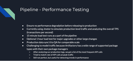 由于Artifactory支持多种类型的包因此在流量模型是一个挑战,Capital One通过分析日志获取常用API,并在流量峰值时期测试API调用速度。