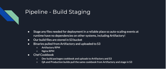 本阶段的所有文件都需要部署在一个高可靠的位置,以便在系统运行时进行自动扩展不需要去依赖其他任何系统包括Artifactory。Capital One选择了S3进行外部存储。所有制品与chef cookbook都从Artifactory拉取并存到s3中。