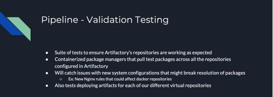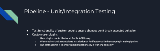 单元/集成测试,用于验证代码的更新不会破坏预期的功能。主要应用于用户自定user plugin的测试。流水线通过容器方式拉起Artifactory安装并测试这些custom plugin,确保其正确工作,避免在生产环境中进行测试。
