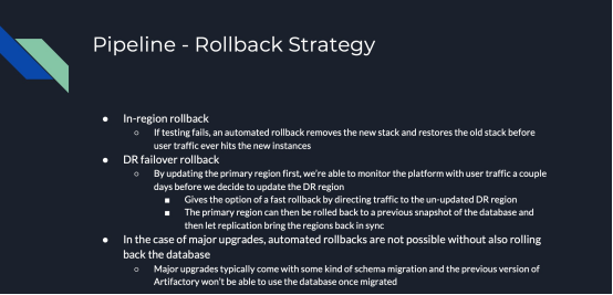 - DR容错回滚。当主集群升级成功后,或监测几天用户流量,没有问题的时候再更新容灾集群。如果在这几天中发现问题,就会启动容错回滚:用户流量切换到DR集群,主集群回滚到之前版本,数据库回滚到之前的快照,再通过Artifactory Replication同步数据,最后再把流量切换回回滚后的工作集群。目前