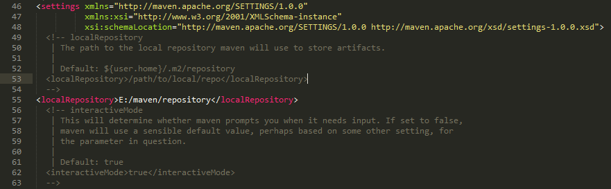 修改 Maven 本地仓库存放位置,找到Maven\conf\setting.xml的55行,添加,设置为本地仓库,否则默认在C盘${user.home}/.m2/repository下。