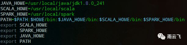 export SPARK_HOME=/usr/local/sparkexport PATH=${JAVA_HOME}/bin:${HADOOP_HOME}/bin:${HADOOP_HOME}/sbin:${SPARK_HOME}/bin:${SPARK_HOME}/sbin:$PATH