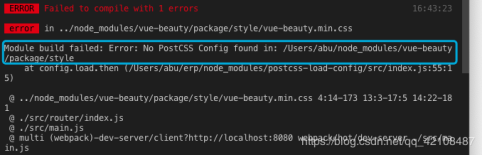 6,运行时报错Module build failed: Error: No PostCSS Config found in: /Users/abuuio/node_modules/vue-beauty/package/style at config.load.then (/Users/abuuio/Home/node_modules/postcss-load-config/src/index.js:55:15)
