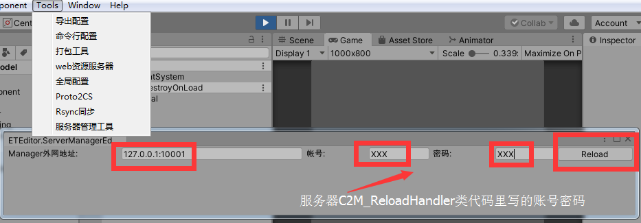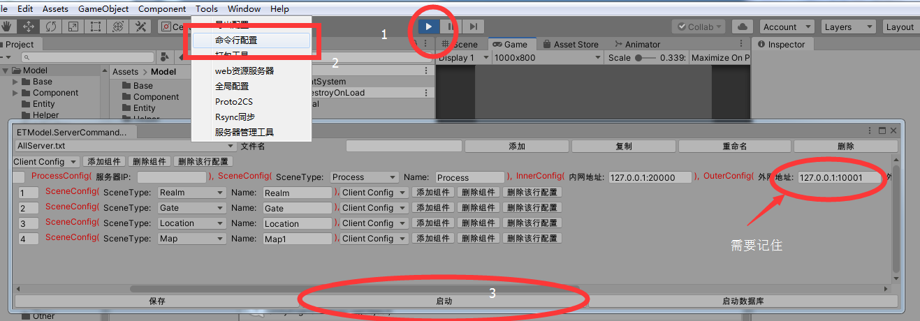 2.Unity开启Init场景,打开Tools->命令行配置->启动服务器