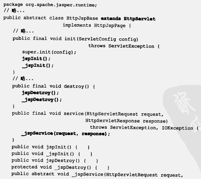 如果是在Tomcat或Glassfish中,由于转译后的Servlet是继承自HttpJspBase类,所以打开该类,就可以发现为什么:
