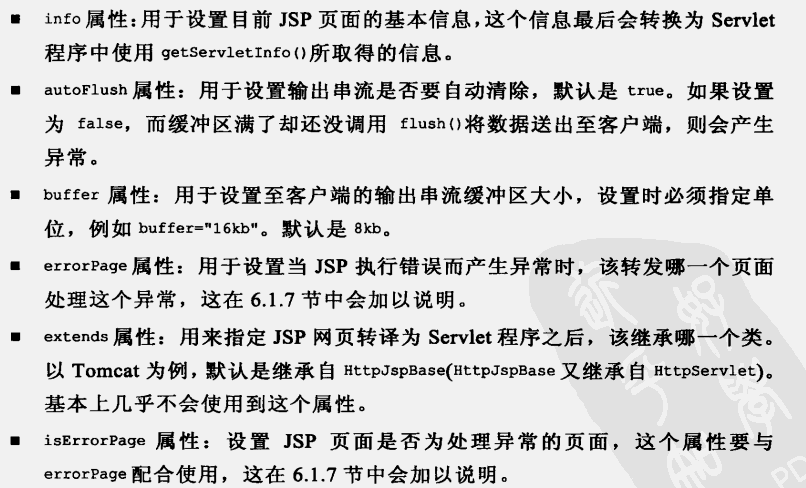 在编写JSP页面时,可以通过page指示元素的buffer属性来设置缓冲区的大小,默认值是8kb。缓冲区满了之后该采取哪种行为,则是由autoFlush属性决定值,默认值是true,表示满了就直接清除。如果设置为false,则要自行调用JspWriter的flush()方法来清除缓冲区,如果缓冲区满了却还没调用flush()将数据送出至客户端,调用println()时将会抛出IOException异常。