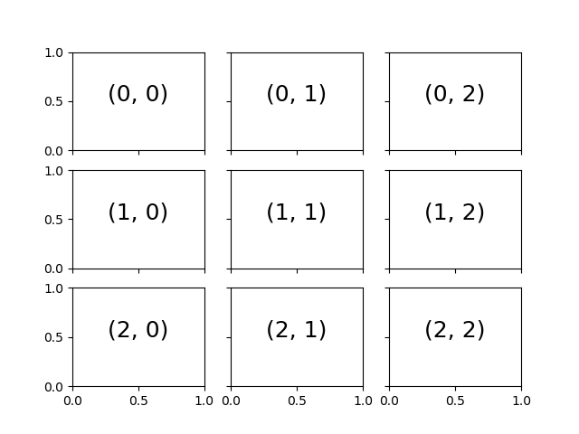 ax[i, j].text(0.5, 0.5, str(( i, j)), fontsize=18, ha='center')