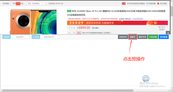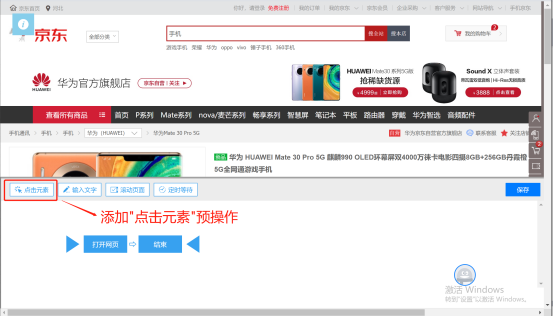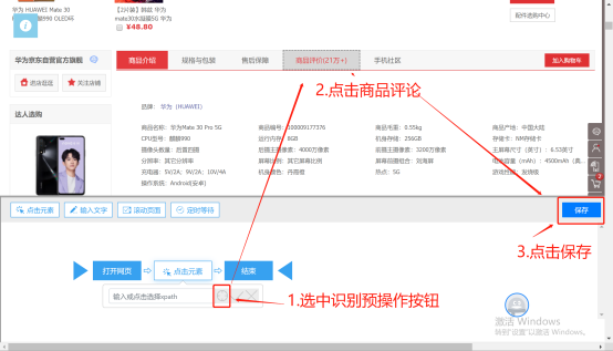 ③因为是采集评论所以还需要进行下预操作配置切换页面:点击预操作按钮-->添加点击元素按钮-->左键点击流程图中添加元素按钮(悬浮显示操作键)-->点击悬浮显示操作键<选择按钮> -->点击网页商品评论TAB页切换按钮 -->点击保存