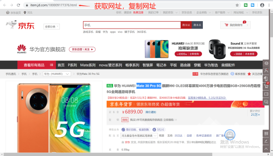 ①本文对京东平台的手机进行爬虫,首先进入京东商城,选择一款手机,这里以华为Mate 30 Pro 5G为例