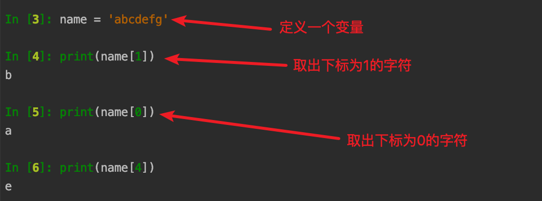 如果想取出部分字符,那么可以通过下标的方法,(注意python中下标从 0 开始)