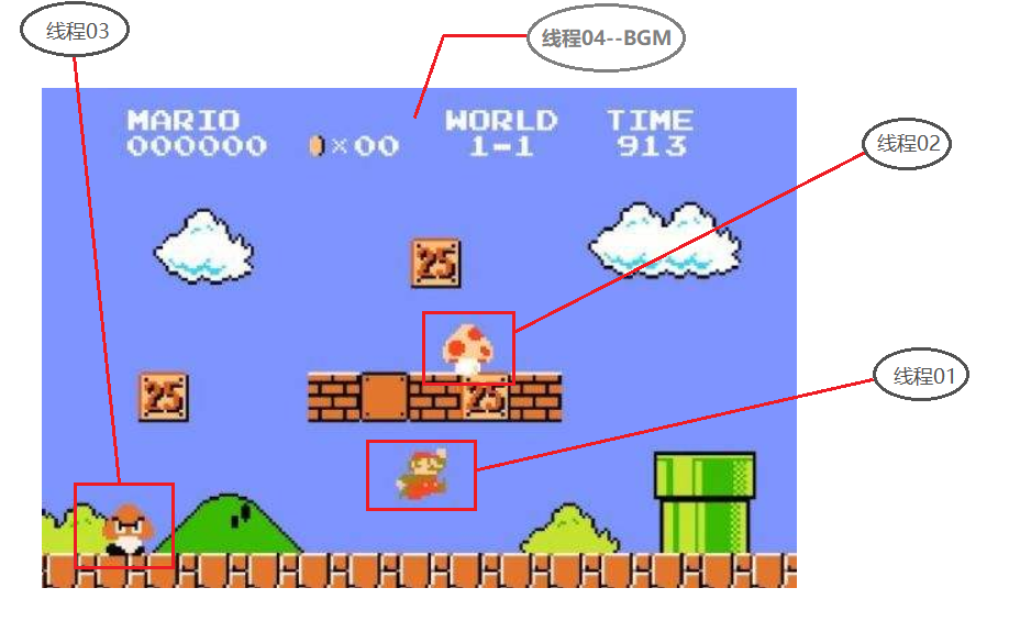 图中,玩家手柄控制的主角马里奥是一个独立的线程,能吃的会走动的蘑菇是一个独立的线程,而行走中的敌人香菇君也是一个独立的线程,另外背景音乐也是一个线程。当然,这幅游戏画面中,还有其他许多的线程在工作,这些众多的线程共同组成了这一生动活泼的经典游戏,读者可以自己思考这款游戏中还有哪些线程在默默地为游戏玩家提供服务。