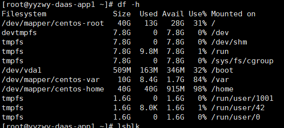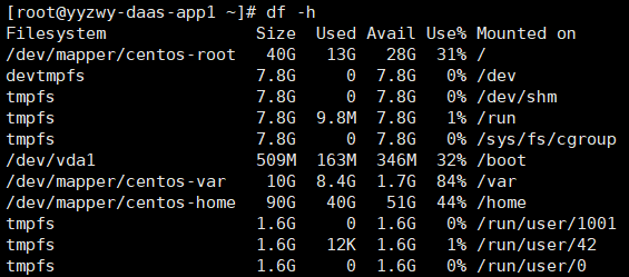 首先,通过 df -h 命令查看各目录空间使用比率:
